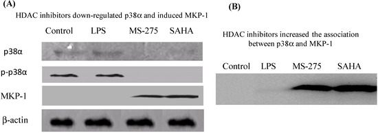 The impact of MS-275 and SAHA on p38α and MAPK phosphatase-1 (MKP-1) were assessed by western blot (Figure 1A). p38α was expressed and activated (phosphorylated) in E11 cells even without LPS stimulation. This was in agreement with the clinical observations [8,14]. LPS did not alter p38α or p-p38α protein levels. However, MS-275 and SAHA (50 nM) dramatically suppressed p38α expression and activation. The activity of p38 MAPK is tightly regulated by MKP-1, an endogenous inhibitor for p38α [14]. MKP-1 was not detected in non-treated or LPS-stimulated E11 cells. On the other hand, MS-275 and SAHA significantly induced MKP-1 (Figure 1A). Furthermore, the association between p38α and MKP-1 was enhanced after HDAC inhibitor treatment (Figure 1B). The suppressive effects of MS-275 and SAHA on p38 MAKP signaling appeared to be due to the combined effects of inhibition of p38α and induction of MKP-1 expression, which deactivates p38α by the removal of the phosphate at the 180 and 182 amino acid residues [14].