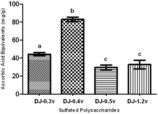 Total antioxidant capacity of sulfated polysaccharides extracted from the marine brown seaweed D. justii. The results are expressed as AAE. Each value is the mean ± SD of three determinations: Different letters (a, b, c) indicate a significant difference (p < 0.05) between sulfated polysaccharides.