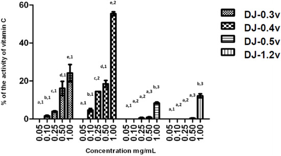 The reducing power test evaluates the capacity of a sample to donate electrons. The result of this test is expressed in reducing activity equivalent to ascorbic acid in a concentration of 0.1 mg/mL (Figure 2). The data obtained from the test of the reducing power present a profile similar to that observed in the TAC test; in other words, DJ-0.3v and DJ-0.4v were more potent than the glucans. DJ-0.3V exhibited a dose-dependent effect, but upon comparing its activity with that of the fucan DJ-0.4v, it was observed that DJ-0.3v had lower reducing agent potency. This fact was observed at all tested concentrations and it was even more evident at the highest evaluated concentration (1.0 mg/mL) because at this concentration, DJ-0.4v presented twice the reducing power capacity as that observed in DJ-0.3v. The values obtained with DJ-0.4v were close to those obtained with a fucan extracted from D. delicatula, another alga of the genus Dictyopteris. This fucan, called F1.3v, presented an activity of 53.2% of vitamin C activity [21]. The glucans DJ-0.5v and DJ-1.2v were less potent and presented a maximum activity of 8.8% and 12.2% (1.0 mg/mL), respectively.