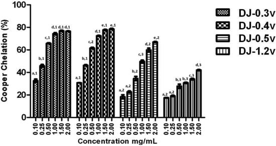 Copper chelating activity of sulfated polysaccharides from the brown algae (seaweed) D. justii. Each value is the mean ± standard deviation of three determinations: Different letters (a, b, c, d, e) indicate a significant difference (p < 0.05) between each concentration of the same sulfated polysaccharide. Different numbers (1, 2, 3) indicate a significant difference (p < 0.05) between the same concentrations of different sulfated polysaccharides.