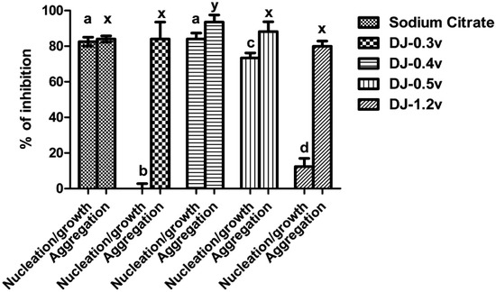 In Figure 4 it can be observed that the fraction DJ-0.3v was not able to inhibit nucleation and DJ-1.2v had low activity, with only 12.4% of inhibition. The best results were those observed for the polysaccharides DJ-0.5v and DJ-0.4v, whose nucleation inhibition capacity was 73.33% and 84.07%, respectively, a similar effect to that observed with sodium citrate (0.25 mM). Regarding the clustering of the crystals, the values of aggregation inhibition found in the presence of polysaccharides varied between 86% and 80%. Only the values of DJ-0.4v were statistically different from other polysaccharides (86%), and even greater than sodium citrate, whose clustering inhibition capacity was 84%.