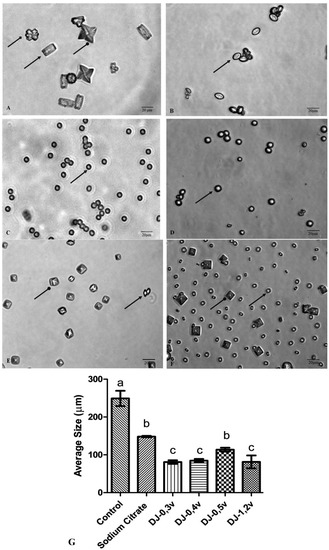 shows COT form; (G) Average size of formed crystals. Different letters (a,b,c) indicate a significant difference (p < 0.05) between the control, sodium citrate and the different polysaccharides. Scale Barr = 20 μm.
