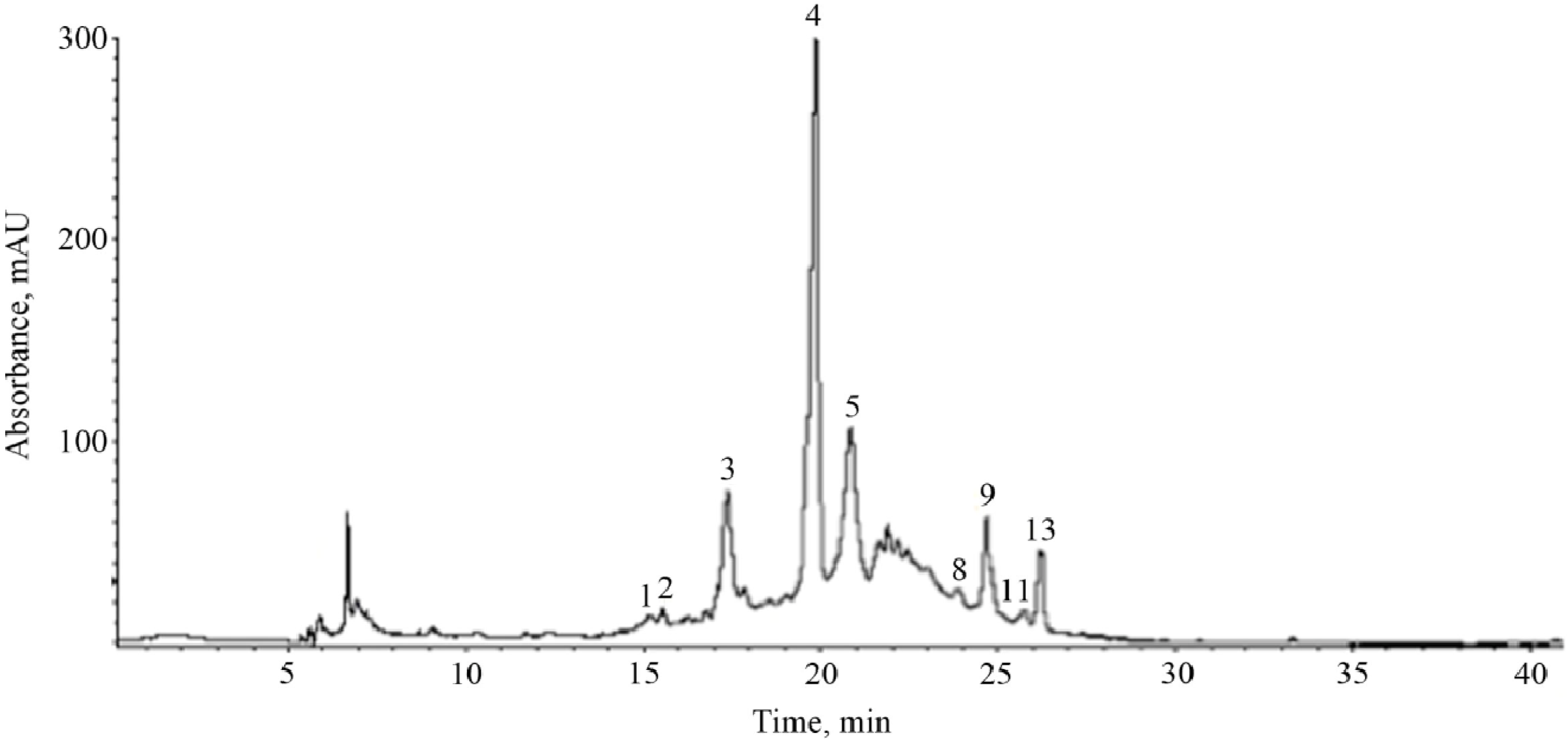 HPLC profile of phenolic compounds in black cherry peel. Peak numbers correspond to those in Table 4.