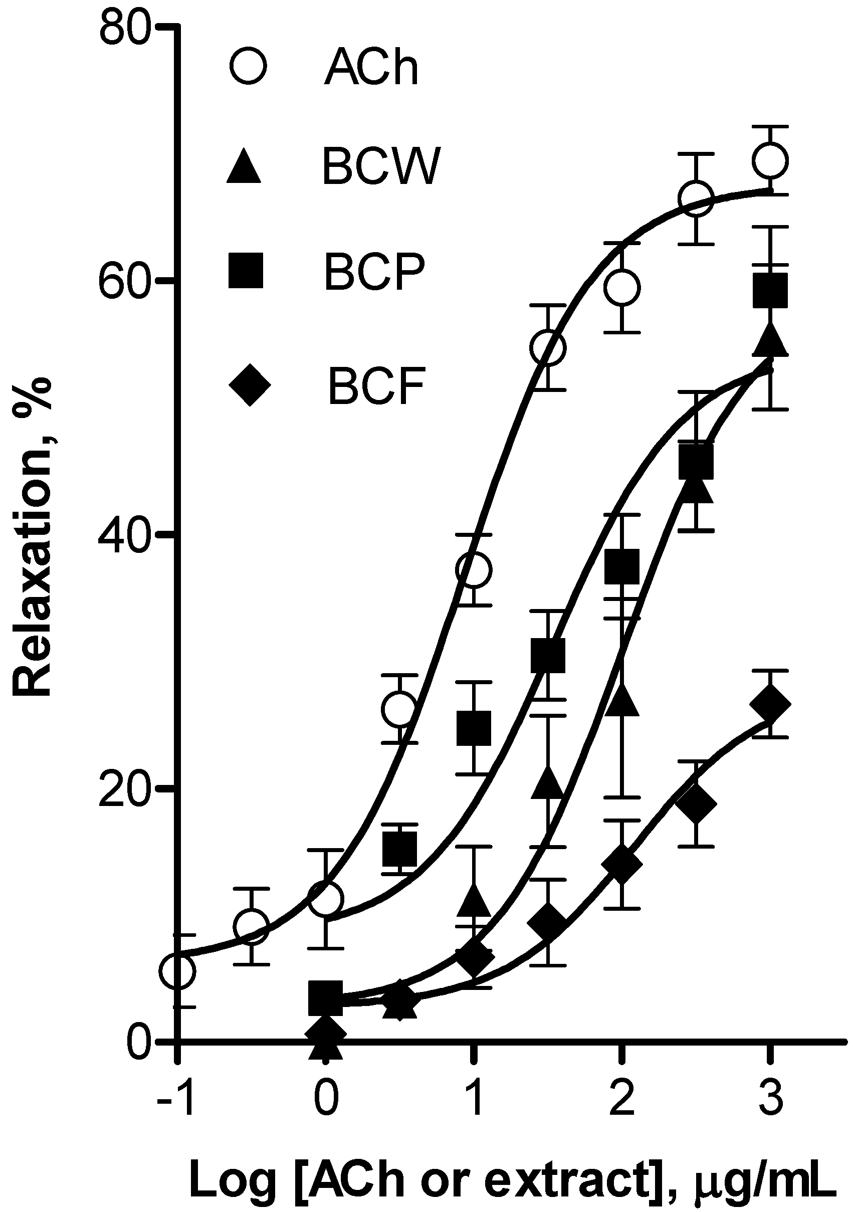 Concentration-response curves for the vascular relaxant effect of whole (BCW), peel (BCP) and flesh (BCF) black cherry and acetylcholine as positive control (ACh). These curves are presented as percentage of relaxation of rat aortic rings pre-contracted by l-phenylephrine (1 µM) as a function of extract concentration. All extracts elicited vasodilatation in a dose-dependent manner. Each individual value is a mean ± SEM (n = 6).