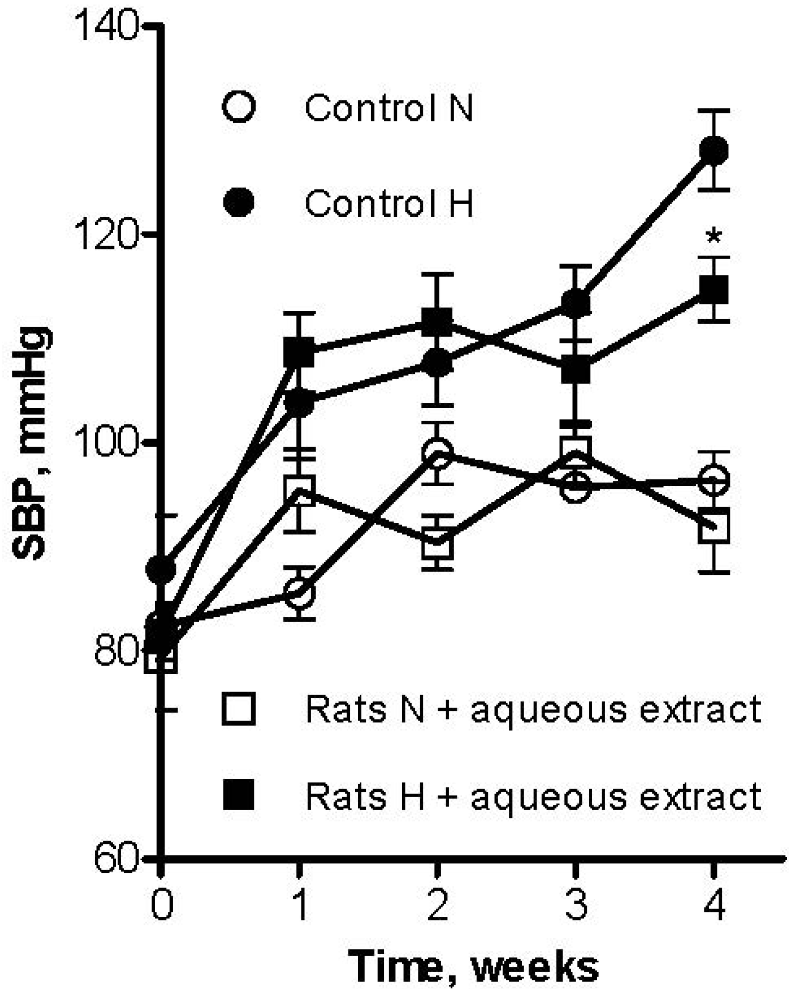 Effect of long-term oral administration of aqueous extract of black cherry fruits (300 mg/Kg/day) on systolic blood pressure (SBP) in L-NAME (30 mg/Kg/day) induced hypertensive rats (H), and normotensive rats (N). Control indicates rats receiving only tap water. Values are mean ± SEM (n = 6 rats for each group). * p ˂ 0.05 vs. control.