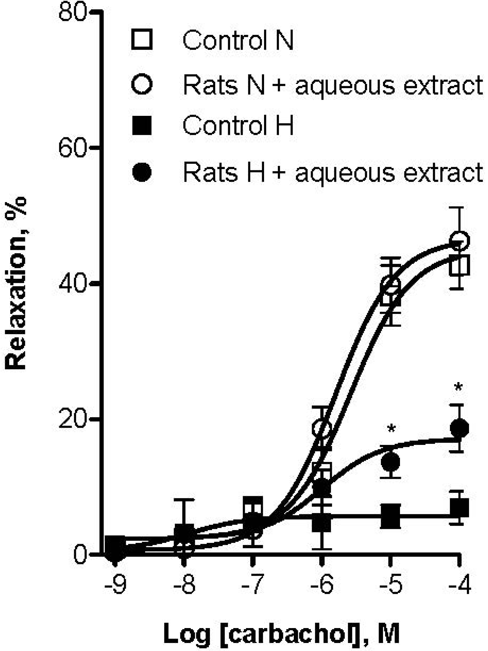 Effect of long-term oral administration of aqueous extract of black cherry fruits (300 mg/Kg/day) on vascular reactivity after four weeks treatment. Concentration-response curves are presented as percentage of relaxation of rat aortic rings pre-contracted by L-phenylephrine (1 µM) as a function of carbachol (CCh) concentration. L-NAME hypertensive induced rats group that received black cherry extract showed better response to CCh than L-NAME hypertensive induced rats group that not received black cherry extract. Normotensive rats groups had no significant difference from each other in their vascular reactivity. Each individual value is a mean ± SEM (n = 6). * p ˂ 0.05 vs. control.