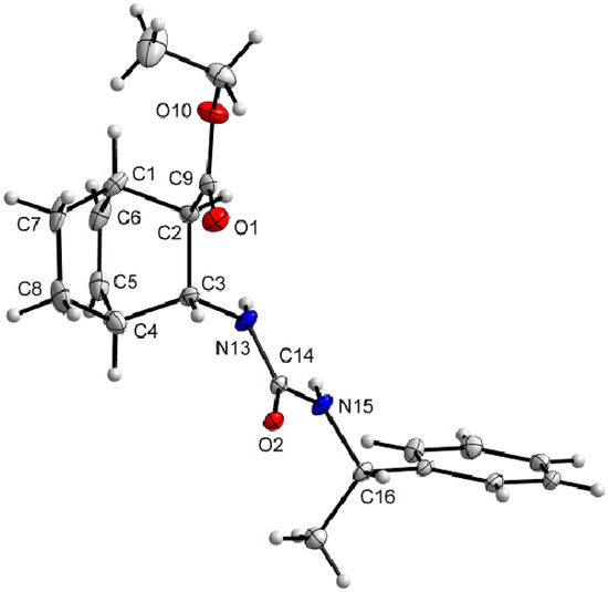 = –101 (c, 0.2, EtOH) 1H-NMR: δ = 0.92–1.06 (m 1H, H-7) 1.19–1.23 (m, 1H, H-7) 1.16 (t, J = 7.1, 3H, CH3) 1.28 (d, J = 6.9 (3H, CH3) 1.36–1.52 (m, 2H, H-8), 1.95 (m, 1H, H-2) 2.58 (m, 1H, H-1) 2.70 (m, 1H, H-4) 4,08–4.23 (m, 3H, OCH2, H-3) 4.64 (m, 1H, CH) 5.54 (d, J = 7.9 H, NH) 6.12–6,21 (m, 2H, H-5, NH), 6.44 (t, J = 7.3, 1H, H-6) 7.14–7.35 (m, 5H, Ar) 13C-NMR: δ = 14.9, 20.3, 23.3, 24.3, 33.6, 36.0, 49.3, 51.5, 53.1, 60.8, 126.6, 127.3, 129.1, 132.8, 135.7, 146.5, 157.3, 173.8, Anal. Calcd for C20H26N2O3 (342.43): C 70.15, H 7.65, N 8.18. Found C 70.31, H 7.79, N 8.27.3.8. Racemic Compounds