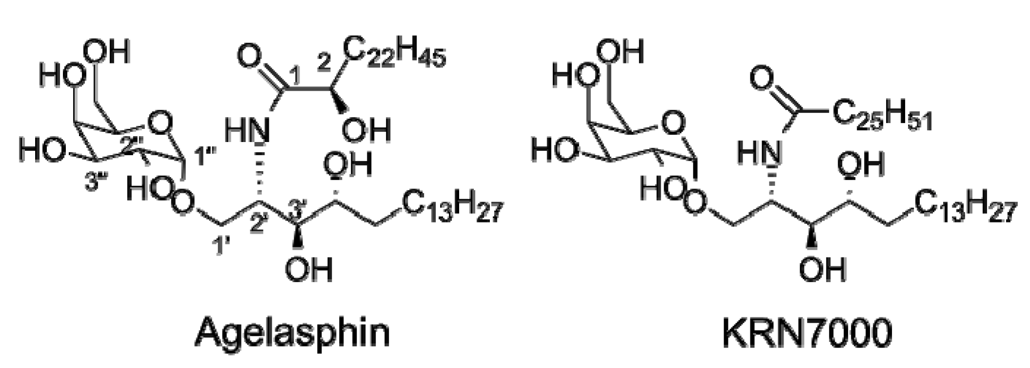 - Kinjo, Y.; Pei, B.; Bufali, S.; Raju, R.; Richardson, S.K.; Imamura, M.; Fujio, M.; Wu, D.; Khurana, A.; Kawahara, K.; et al. Natural sphingomonas glycolipids vary greatly in their ability to activate natural killer T cells. Chem. Biol. 2008, 15, 654–664. [Google Scholar] [CrossRef]