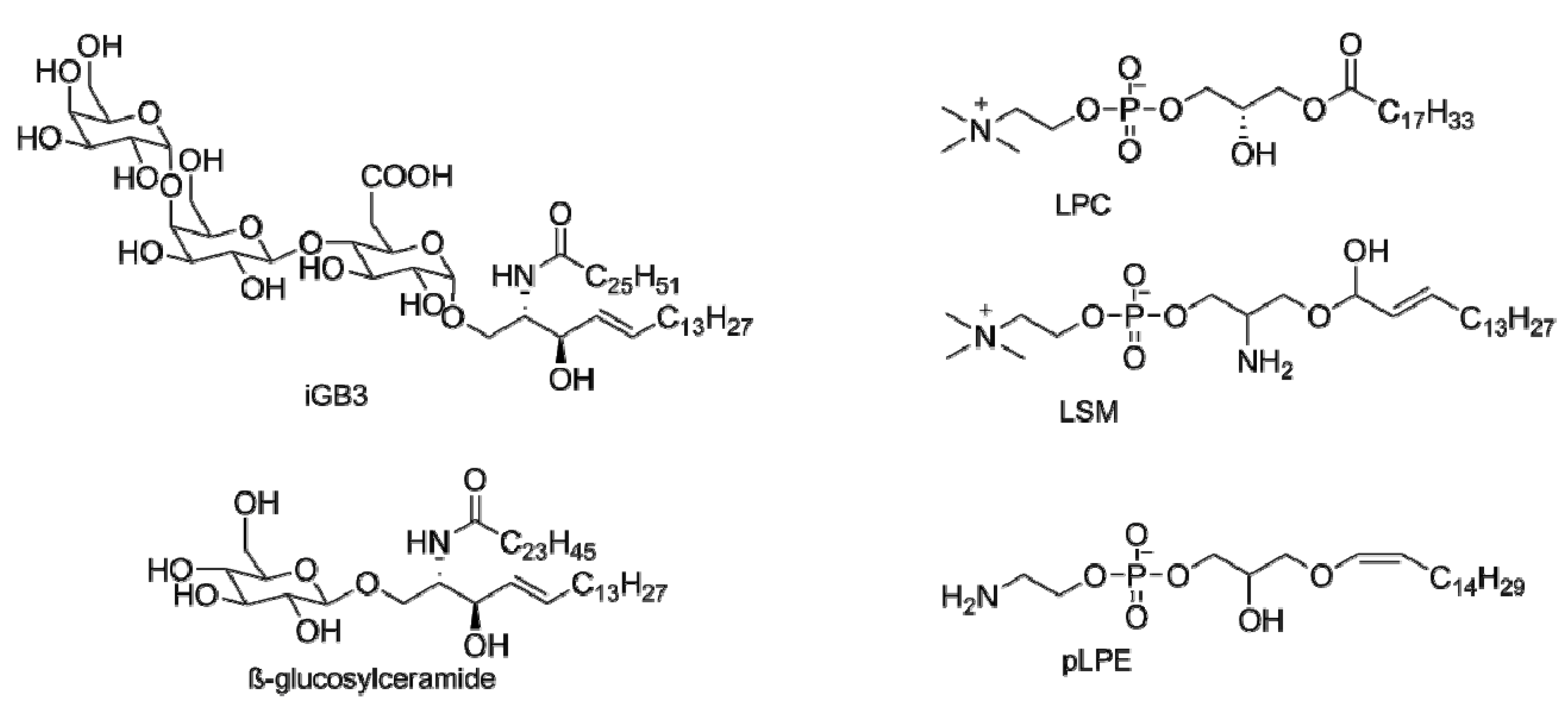 In the continuing effort to identify endogenous antigens, Libero and coworkers [63] extracted and fractionated lipids from mouse thymocytes and tested their ability to stimulate freshly isolated iNKT cell thymocytes. Further purification via HPLC and characterization via tandem mass spectrometry identified two phosphoethanolamine endogenous iNKT cell antigens, namely eLPA and pLPE (Figure 3). These peroxisome-derived ether-bonded phosphoethanolamine compounds induced similar IL-4 production when compared to α-GalCer. GNPAT knockout mice, mice lacking a key enzyme necessary for the synthesis of these compounds, exhibit multiple abnormalities as well as decreased numbers in iNKT cells further supporting the importance of these lipids. GNPAT knockout mice had reduced numbers of iNKT cells further suggesting the presence of multiple selecting endogenous antigens for the maturation of iNKT cells.