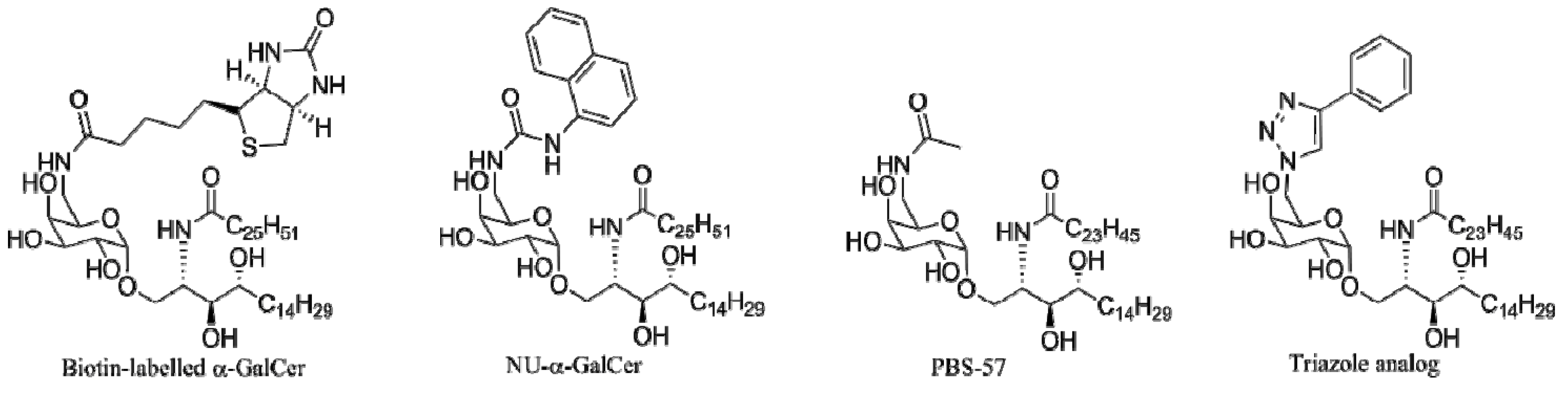- Xia, C.; Zhang, W.; Zhang, Y.; Woodward, R.L.; Wang, J.; Wang, P.G. Facile synthesis of biotin-labelled α-galactosylceramide as antigen for invariant natural killer T cells. Tetrahedron 2009, 65, 6390–6395. [Google Scholar] [CrossRef]