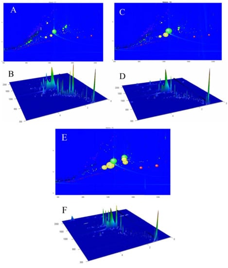 GC×GC-TOF/MS contour plots and three-dimensional chromatograms of non-fumigated (A/B), lab-prepared sulfur-fumigated (C/D) and industrial sulfur-fumigated (E/F) Flos Lonicerae Japonicae volatile oils. Peak identification information is provided in Table 1.