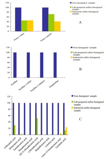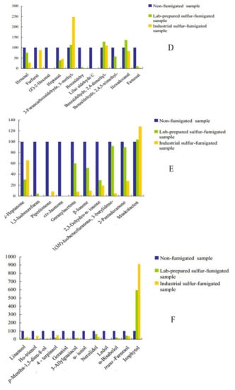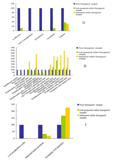 Comparison of the contents of major components in non-fumigated, lab-prepared sulfur-fumigated and industrial sulfur-fumigated Flos Lonicerae Japonicae volatile oils. (A) Furans, (B) Alkalies, (C) Acids, (D) Aldehydes, (E) Ketones, (F) Alcohols, (G) Terpenes, (H) Esters and (I) Others.