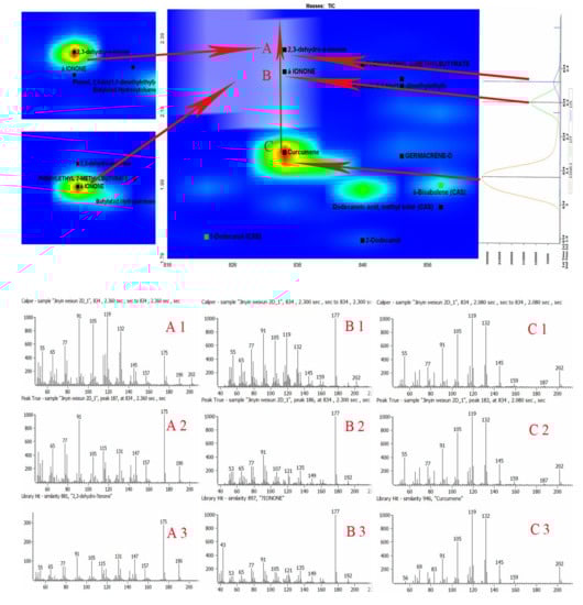 The identified chemical groups of Flos Lonicerae Japonicae volatile oil in the GC×GC chromatograms and the spectra of 2,3-dehydro-α-ionone (A), α-ionone (B) and curcumene (C) in sample and in NIST library, respectively (1: Caliper Spectra; 2: Deconvoluted Spectra; 3: NIST Library Spectra).