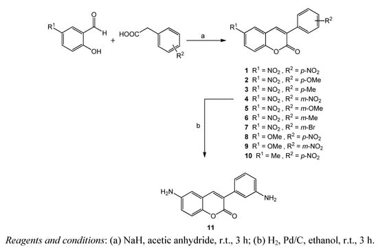 Based on previous findings in the area [24,25], and in our experience with substituted 3-arylcoumarins [15,31,32], in the present work we proposed the synthesis and antibacterial evaluation of a series of different substituted amino/nitro 3-arylcoumarins (Scheme 1). With the aim of finding the structural features for the antibacterial activity and selectivity, we decided to explore the importance of the nature and position of small groups (methoxy, bromo, nitro, amino and methyl substituents) into both coumarin nucleus and 3-aryl ring (Scheme 1).