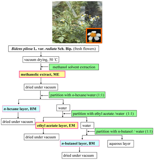 Flow chart of solvent extraction and liquid-liquid partition in different solvent polarity on flower part of Bidens pilosa L. var. radiata.