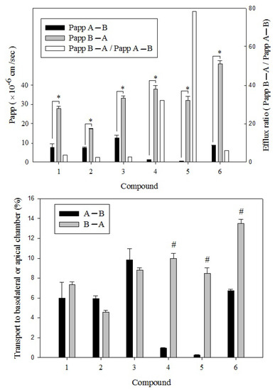 The apparent permeability coefficient (Papp) (upper panel) and the transport percentage (lower panel) of each compound in EM of BPR in the secretory (B–A) direction (⃞) and in the absorptive (A–B) direction (⬛), and the efflux ratio (⃞). The structures and names of compounds 1–6 are referred to Figure 2. * Papp value of each tested compound in the secretory (B–A) direction significantly greater compared with Papp value in the absorptive (A–B) direction (p < 0.05). # Transport of each compound in EM of BPR in the secretory (B–A) direction significantly greater compared with in the absorptive (A–B) direction (p < 0.05).