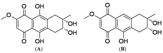 4-Deoxybostrycin (Figure 1A), a natural anthraquinone compound, was first isolated from the fungus Alternaria eichhorniae [4]. Its structure was identified by interpretation of spectral data [5,6]. Nigrosporin (Figure 1B) is the deoxy-derivative of 4-deoxybostrycin. It was also a natural product which was first isolated from the fungus Nigrospora oryzae. Its structure was identified by interpretation of spectral data [7]. Recently we obtained 4-deoxybostrycin and nigrosporin isolated from the fungus Nigrospora sp. [8,9]. It has been reported that 4-deoxybostrycin has various biological properties, including antibacterial [8], phytotoxic [4,10], antimalarial [11], and cytotoxic activities [8,12]. However, its anti-mycobacterial activity is not well investigated.