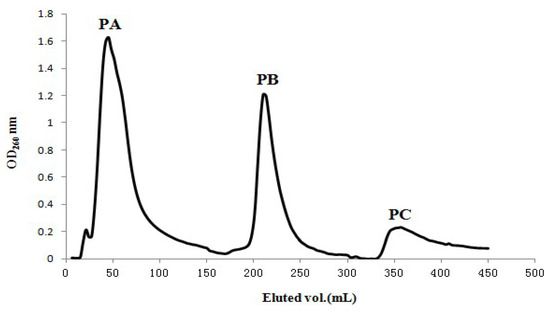 The elution profile of fractions PA, PB and PC from crude extract P on NKA macroporous resin were shown in Figure 1. Then fraction PB was chosen for analysis on Sephadex G15 (Figure 2). The resulting fractions PB1, PB2 and PB3 were collected separately.