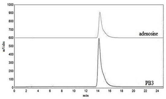 Fraction PB3 was purified on a HPLC preparative column followed by an analytical column eluting with 15% methanol. Concurrently, the retention time of PB3 and standard adenosine matched well (Figure 3). Moreover, mass spectrometric analyses using electrospray ionization mass spectrometry (ESI-MS) showed that the m/z [M+H]+ of PB3 was 268.1040 Da, which corresponded to a molecular mass of 267.2 Da (Figure 4) and a molecular formula of C10H13N5O4. This matched the data in the online database for adenosine [10]. Therefore, it could be concluded that PB3 was adenosine.