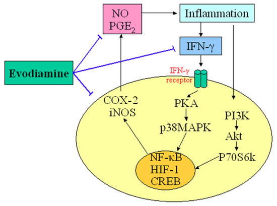 An appreciable amount of research has reported on the potential anti-inflammatory properties and the possible underlying mechanisms of action of evodiamine. Nitric oxide (NO) is a highly reactive molecule produced from the amino acid arginine by the enzyme NO synthase (NOS). Inappropriate, excessive production of NO is largely responsible for pathogenesis of various inflammatory diseases [15]. Chiou et al., examined the possible anti-inflammatory effects of evodiamine by assessing its effects on NO production in cultured murine macrophage-like cell line RAW 264.7 [16]. Their results indicated that evodiamine inhibited NO production by interfering with the interferon-gamma (IFN-γ)-initiated signaling events. Ko et al., also found that anti-inflammatory activities of evodiamine could be partially explained by its potentials for inhibiting inducible nitric oxide synthase (iNOS)-dependent NO production in activated inflammatory cells [17]. In addition, evodiamine was found to inhibit the action of nuclear factor kappa B (NF-κB) and the transcription of cyclo-oxygenase-2 (COX-2). Liu et al. recently demonstrated that evodiamine inhibited COX-2 expression and hypoxia-inducible factor 1α (HIF-1α) accumulation via dephosphorylation of the serine/threonine protein kinase B (PKB/Akt) and the 70 kDa ribosomal S6 kinase (p70S6k), providing evidence for a novel mechanism underlying its anti-inflammatory activity [18]. Moreover, evodiamine has strong inhibitory effects on the synthesis of prostaglandin E2 (PGE2), which is the principal pro-inflammatory prostanoid and contributes to one of the key features of inflammation [19]. These results provide a scientific rationale for the anti-inflammatory use of evodiamine. The central role of evodiamine in the regulation of inflammatory is summarized in Figure 2.