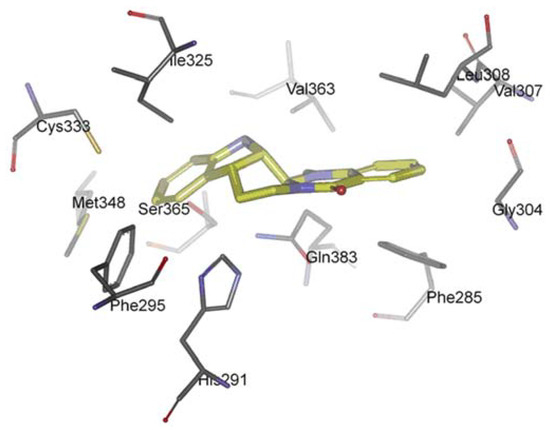 The AhR is a member of the family of basic helix-loop-helix/Per-Arnt-Sim (bHLH/PAS) transcription factors [116]. Non-ligand bound AhR is retained in the cytoplasm as an inactive protein complex bound to several co-chaperones [117,118,119]. Upon ligand binding to AhR, the chaperones are released, AhR imported into the nucleus and dimerized with AhR nuclear translocator (ARNT), leading to changes in gene transcription [120,121,122]. AhR plays a functional role in physiology and toxicology, especially in cellular proliferation and differentiation, the adaptive response, the toxic response, secretion of hormones and immunomodulation [123,124,125,126,127]. Recently, scientists found that AhR activation seems to be also important for cancer and inflammation, supporting the possibility of targeting the AhR for therapy in inflammation and a number of cancers [128,129,130]. Recently, we investigated the interaction between evodiamine and AhR [131]. We observed that a series of hydrophobic residues of AhR are involved in complex formation: Phe285, Phe295, Gly304, Val307, Leu308, Ile325, Cys333, Met348, Val363, and Ser365 (Figure 6). However, there is any hydrogen bond between AhR and evodiamine. Competitive ligand binding assay showed that evodiamine inhibited the specific binding of [3H]-TCDD, the best-characterised AhR agonist, to the AhR with an IC50 value of 44.8 ± 6.5 nM. The corresponding Ki value calculated for evodiamine was 28.4 ± 4.9 nM [131]. AhR binding studies in vitro provided the evidence that evodiamine was able to bind to the AhR as ligand and exhibit antagonistic effects.