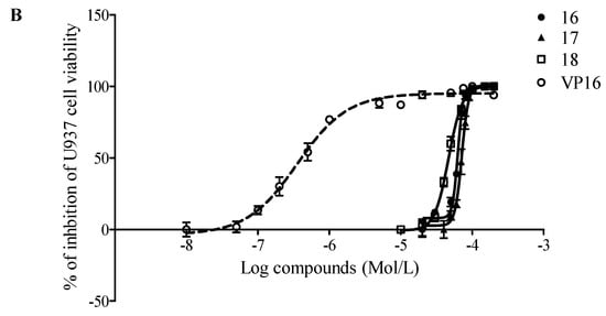 Dose-response profiles of compounds 16–18 and positive control VP16 on viability of K562 (A) and U937 (B) cells. K562 and U937 cell lines were treated for 48 h with increasing amounts of the indicated substances. All the assays were performed in quadruplicates and the results were normalized considering the cultures treated with the vehicle alone (1% DMSO).