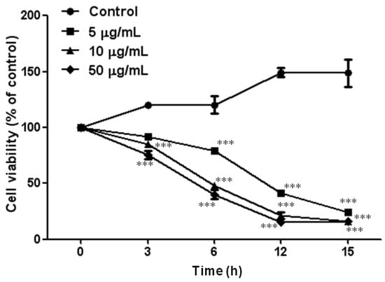 Figure 1. t-HSC/Cl-6 cells were treated with 0–50 µg/mL of PF2401-SF for 0–15 h. Results are expressed as percentage control of cell viability at the corresponding point measured by MTT assay. Data are presented as mean ± S.D. for each point. * p < 0.05, ** p < 0.01, *** p < 0.001 compared to control cells treated with DMSO.