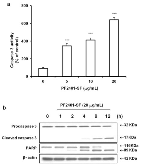 Figure 2. Apoptosis induction in t-HSC/Cl-6 cells treated with PF2401-SF for 12 h at different concentrations. Caspase 3 was measured by colorimetric assay using DEVD-pNA substrate. A strong effect was observed at 20 µg/mL (a). Data are presented as mean ± S.D. for each point. *** p < 0.001 compared to control. Western blot analysis revealed time dependent cleavage of caspase 3 and PARP indicating apoptosis induction in t-HSC/Cl-6 cells exposed to PF2401-SF for 12 h (b).