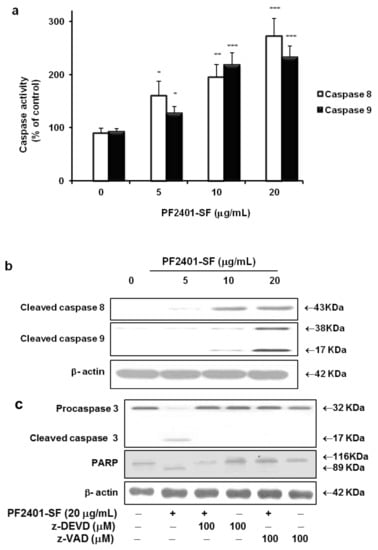 Figure 3. Colorimetric determination using IETD-pNA and LEHD-pNA substrates for caspase 8 and 9 exposed with PF2401-SF for 12 h resulted in dose-dependent activation of both caspases (a). Data are presented as mean ± S.D. for each point. * p < 0.05, ** p < 0.01, *** p < 0.001 compared with the control. Similarly, dose-dependent cleavage of caspase 8 and 9 was observed from western blot analysis (b). Cells were pretreated for 2 h with z-DEVD-fmk (caspase 3 inhibitor) and Z-VAD-fmk (pan-caspase inhibitor) followed by treatment with PF2401-SF for 12 h. PF2401-SF induced cleavage of caspase 3 and PARP was inhibited by pretreatment with caspase inhibitors (c).