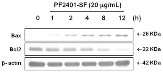Figure 4. Effect of PF2401-SF on pro-apoptotic and anti-apoptotic proteins. Time-dependent downregulation of Bcl2 and upregulation of Bax was found in t-HSC/Cl-6 cells treated with 20 µg/mL PF2401-SF and analyzed by western blot. Regulation of these mitochondrial proteins correlates with apoptosis induction in vitro.