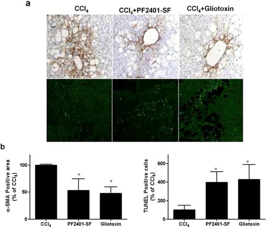 Figure 5. Effect of PF2401-SF on expression of α-SMA in CCl4 intoxicated rat liver (a, upper panel). The expression of α-SMA, a typical marker of activated HSCs in the liver was detected by immunohistochemical staining. Rats were given repeated injection of CCl4 (0.75 mL/kg, p.o., diluted in corn oil) every 3 days for 13 days. Either PF2401-SF (50 mg/kg, p.o., 1 h after CCl4 administration on day 13 and 14) or reference drug gliotoxin (3 mg/kg, i.p., day 14) were also administered, and liver tissues were obtained on day 15. TUNEL assay for determination of apoptotic cells (a, lower panel). The apoptotic cells marked by green fluorescence. Densitometry data showed the statistically significant (* p < 0.05) difference for the PF2401-SF induced dowregulation of α-SMA-positive cells and increased number of TUNEL-positive cells comparing to CCl4 group (b). Representative photographs (n = 5 rats) are shown (original magnification ×100).