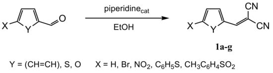 3.2.2. General Procedure for the Synthesis of 3-(Thiophen-2-yl) and 3-(5-Substituted Furan-2-yl)-2-cyanopropenenitriles 1b–g [,]