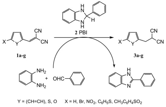 From these tests it was evident that we must look for milder and more selective reducing agent. Herein, we decided to explore 2-phenylbenzimidazoline (2 PBI) as an organic hydride compound to test its abilities in reducing electron-deficient olefins with electron-withdrawing substituents (CN groups) of the furan series. 2-Phenylbenzimidazoline (2 PBI) is unstable in the air and easily oxidized to aromatic 2-phenylbenzimidazole []. Therefore, 2-phenylbenzimidazoline is formed in situ from the ordinary chemicals (i.e., 1,2-diaminobenzene and benzaldehyde) and is expected to be useful as a convenient, mild and selective agent for the reduction of carbon-carbon double bonds in α,β-unsaturated dinitriles 1a–g. After the reaction of an equimolar amount of 1,2-diaminobenzene and benzaldehyde in ethanol at room temperature in the presence of the same amount of 3-(5-nitrofuran-2-yl)-2-cyanopropenenitrile (1e), 2-[(5-nitrofuran-2-yl)methyl]propanedinitrile (3e) was obtained in 62% yield. Although a nitro group was inert towards 2-phenylbenzimidazoline, olefinic double bonds conjugated with nitrile groups were reduced efficiently. For optimizing the conditions, several tests with various solvents (MeOH, THF, CH3CN, DMF) were performed. When methanol or tetrahydrofuran were used as a solvent the reaction proceeded smoothly, but the reaction time was longer, probably due to the lower solubility of the starting material 3-(5-nitrofuran-2-yl)-2-cyano-propenenitrile (1e). Acetonitrile and even more dimethylformamide as reaction solvent catalyzed slow formation of side products. Consequently, ethanol remains as an optimal solvent. When attempts were made to improve the yields and remove the traces of starting α,β-unsaturated dinitrile from the reaction mixtures by increasing the amount of the reagent to 1.2 equivalents, the results showed a disappearance of starting material but the product was a complex mixture. The residues of reducing agent remain in the product. Therefore, all of the experiments were performed with equimolar amounts. In all cases, carbon-carbon double bonds of the 3-(5-substituted furan-2-yl)-2-cyanopropenenitriles were selectively reduced in good yields to give the corresponding 2-[(5-substituted furan-2-yl)methyl]propanedinitriles, while conjugated cyano groups were unaffected, according to Scheme 2.