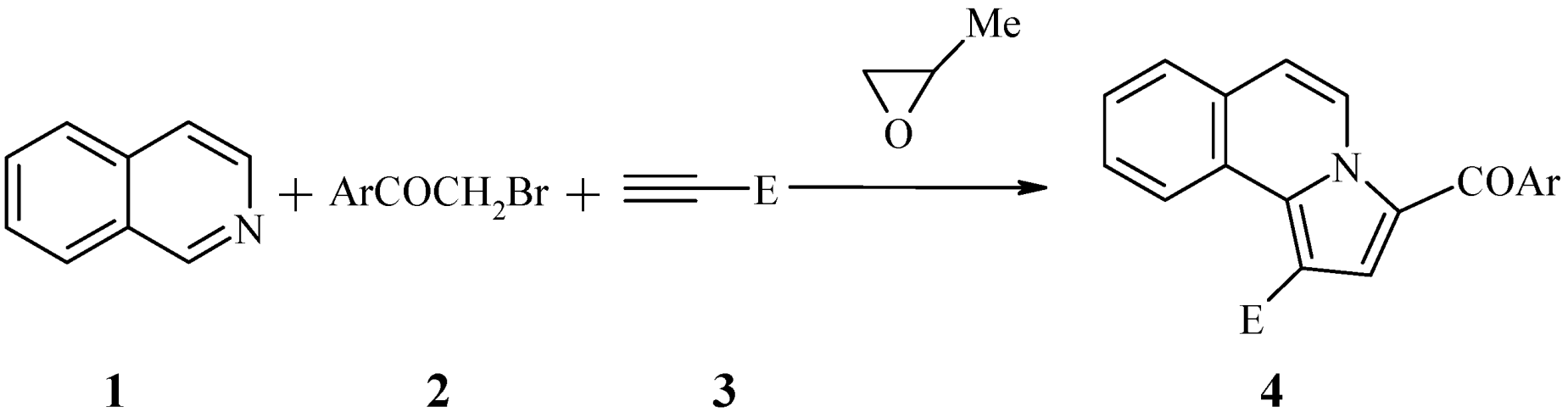 One of the important and current methods for the synthesis of pyrrolo[2,1-a]isoquinolines is the 1,3-dipolar cycloaddition reaction of isoquinolinium N-ylides with activated alkynes or olefins [20,21,22,23,24,25,26,27,28]. Our interest in studying convenient and simple methods for obtaining new pyrroloazine derivatives [29,30,31,32,33,34] led us to expand our studies to pyrrolo[2,1-a]isoquinolines [27]. The success in synthesis of such compounds by two methods involving two step procedures [27] led us to examine the one-pot three component procedure for the synthesis of pyrrolo[2,1-a]isoquinoline derivatives by 1,3-dipolar reactions discussed herein. The key components are isoquinoline, substituted bromoacetophenones and activated acetylenic dipolarophiles which react in 1,2-epoxypropane to yield the desired products with high efficiency.