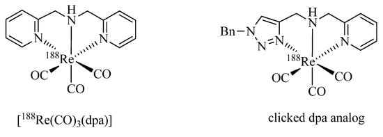 As pointed out above, a large number of non-radioactive natRe-tricarbonyl complexes have been reported for structural elucidation and identification of the analogous 99mTc complexes. Only recently have Wang et al. reported the first example of a chelate in which the 188Re-tricarbonyl core is coordinated by a click ligand (Figure 2) [37]. In their work, the efficiency of the complexation of [188Re(CO)3(H2O)3]Br with bis(pyridine-2-ylmethyl)amine (dpa) was compared with that of a regular click ligand. Even though dpa was shown to be the more efficient chelator, respectable radiolabeling yields (>80%) were achieved with the regular click ligand system.