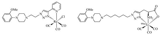Seridi et al. [53] and Hassanzadeh et al. [54,55] have used CuAAC in the development of brain radiotracers. They describe the conjugation of bi- and tridentate regular click ligands to 1-(2-methoxyphenyl)piperazine (MPP), a pharmacophore frequently found in imaging agents selective for 5-HT1A, a receptor subtype for the neurotransmitter serotonin (5-hydroxytryptamine, 5-HT; Figure 7). The radiotracers exhibited favorable low protein binding, good blood serum stability, and a lipophilicity suitable to cross the blood-brain barrier (BBB). The compound functionalized with a tridentate click ligand was labeled with [99mTc(CO)3]+ and evaluated in vitro and in vivo. Receptor saturation experiments performed with homogenated hippocampus membranes of rats revealed a high receptor affinity (KD) of the compound in the single-digit nanomolar range. In vivo experiments with rats indicated a specific uptake of the radiotracer in the brain, being highest in the hippocampus. Both groups conclude that the 99mTc-labeled MPP derivatives have suitable characteristics for use as central nervous system (CNS) receptor specific imaging agents.