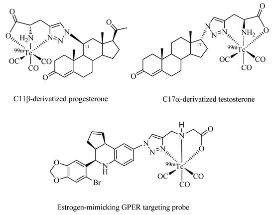 Finally, implementation of Click-to-Chelate to steroid-based radiotracers is discussed (Figure 8). Dhyani et al. have investigated 99mTc-tricarbonyl-labeled derivatives of 11ß-progesterone and 17α-testosterone for targeting progesterone (PR) and androgen receptors (AR), which are overexpressed in breast and prostate cancer, respectively [56,57]. The compatibility of the site of functionalization of the steroids with regards to biological function as well as stereochemical considerations were taken into account for the design of the radiotracers. While the synthesis of the compounds was straight forward and the stability of the radiometal complexes in biological media was excellent, experiments in vivo using Swiss mice or Wistar rats did not reveal specificities towards the corresponding receptors. These findings may be the result of the bulkiness of the 99mTc chelate in comparison to the steroid vector, which could interfere with the interaction of the compound with its binding site.