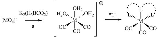 Because of the diverse redox chemistry of technetium and rhenium, a wealth of complexes differing in coordination numbers and geometries has been reported. Here, we focus on the technetium and rhenium-tricarbonyl cores ([M(H2O)3(CO)3]+, or short [M(CO)3]+; M = 99mTc(I), 186/188/natRe(I)). 99mTc- and 186/188Re-tricarbonyl can be prepared by reduction of the corresponding permetallates ([M(VII)O4]−) using K2[H3BCO2] (e.g., by the commercial IsoLinkTM kit; Scheme 1). [M(CO)3]+ contains three tightly coordinated CO ligands and three water molecules, the latter of which can be readily replaced by mono-, bi-, and tridentate ligand systems, or a combination thereof. Complexes of [M(CO)3]+ exhibit a low spin d6 configuration, which renders the metal inert and hence, provides complexes with high in vivo stability essential for medical applications [5]. In addition, octahedral complexes of [M(CO)3]+ are generally smaller than octahedral or square-pyramidal complexes of the corresponding metals in higher oxidation states (e.g., M(V)-oxo cores) and are therefore considered less likely to impact important characteristics of (bio)molecules to which they are conjugated to.