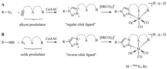 Schematic representation of the synthesis of regular (A) and inverse (B) 1,2,3-triazolyl ligand systems for the complexation of the [M(CO)3]+ core. A and B represents various functional groups for coordination of the tricarbonyl core.