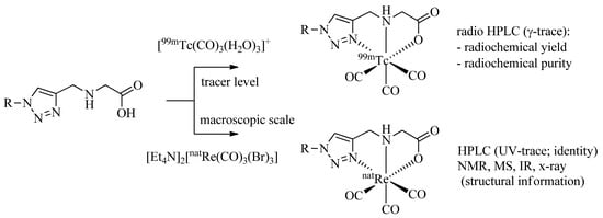 It is common practice to identify 99mTc-complexes prepared on a no carrier added (n.c.a.) level by comparison with the corresponding non-radioactive natRe analogues by HPLC (γ-trace versus UV-trace; Scheme 4). In addition, the corresponding natRe-tricarbonyl complexes allow structural analysis by spectrometric and spectroscopic methods including IR, MS, and NMR. natRe analogues of 99mTc-tricarbonyl complexes can be synthesized conveniently on a macroscopic scale by the reaction of the ligand system of interests with [Et4N]2[Re(CO)3(Br)3] [32] in alcohol or water according to published procedures. In all cases discussed above (and more examples have been reported in the meantime), the corresponding natRe-tricarbonyl complexes were prepared and fully characterized. In addition, more than half a dozen reported X-ray structures confirm the formation of fac-M(CO)3 complexes by tridentate coordination of the triazolyl ligands as depicted in, e.g., Figure 1, Table 1, or Scheme 5B [33,34,35,36].