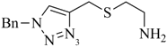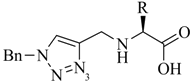 The second approach to multifunctional conjugates involves chelators containing two 1,4-disubtituted 1,2,3-triazoles derived from the CuAAC of azides with a bis-alkyne precursor (Scheme 5B) [36]. The latter can be readily obtained by the stepwise Nα-alkylation of, e.g., glycine with propargyl bromide or silyl protected derivatives thereof. One molecule (R1) can be selectively linked to the glycine precursor by amide bond formation. The other two molecules (R2 and R3) are conjugated by sequential CuAAC, first with the terminal alkyne and, after removal of the silyl protective group, with the second alkyne functionality. Thus, this strategy provides access to overall tetrafunctional conjugates by joining three different chemical or biochemical moieties with the 99mTc-tricarbonyl core. The utility of the approach was demonstrated by the conjugation of a GRPr targeting bombesin derivative with a related bis-triazole ligand system to which two carboxylates were linked to by the CuAAC [36]. The observed low renal uptake and retention of the conjugate in vivo suggests that the two appending carboxylates act as pharmacological modulators, which successfully masked the otherwise unfavorable positive charge of the conjugate as the result of the cationic metal chelate.
