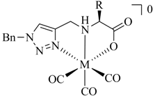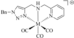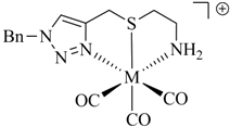 Since the first report of the 99mTc-tricarbonyl core [99mTc(H2O)3(CO)3]+ in 1998 by Alberto and Schibli et al. [6] numerous ligand systems and their coordination with [M(CO)3]+ have been investigated. In particular, tridentate chelators containing N-, S-, or O-donors have been shown to provide well-defined and stable organometallic complexes, which are suitable for application in vivo (Figure 1) [7,8] Also, functionalized η5-ligand cyclopentadienide as well as carboranes [9] have been used for the stable complexation of the tricarbonyl core. A thorough discussion of the literature on ligand systems reported for the complexation of [M(CO)3]+ is beyond the scope of this article and instead, it is referred to some excellent reviews on the general topic of 99mTc chelation chemistry (see e.g., [10]).