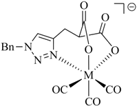 Examples of prochelators, formation of tridentate triazolyl ligands by CuAAC with benzyl azide (entry 1–5) or 3-phenyl-1-propyne (entry 6), and complexes with [M(CO)3]+ thereof.