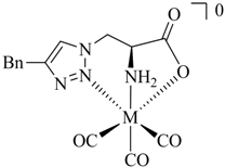 - Mindt, T.L.; Struthers, H.; Spingler, B.; Brans, L.; Tourwé, D.; García-Garayoa, E.; Schibli, R. Molecular Assembly of Multifunctional 99mTc Radiopharmaceuticals Using “Clickable”Amino Acid Derivatives. ChemMedChem. 2010, 5, 2026–2038. [Google Scholar] [CrossRef]