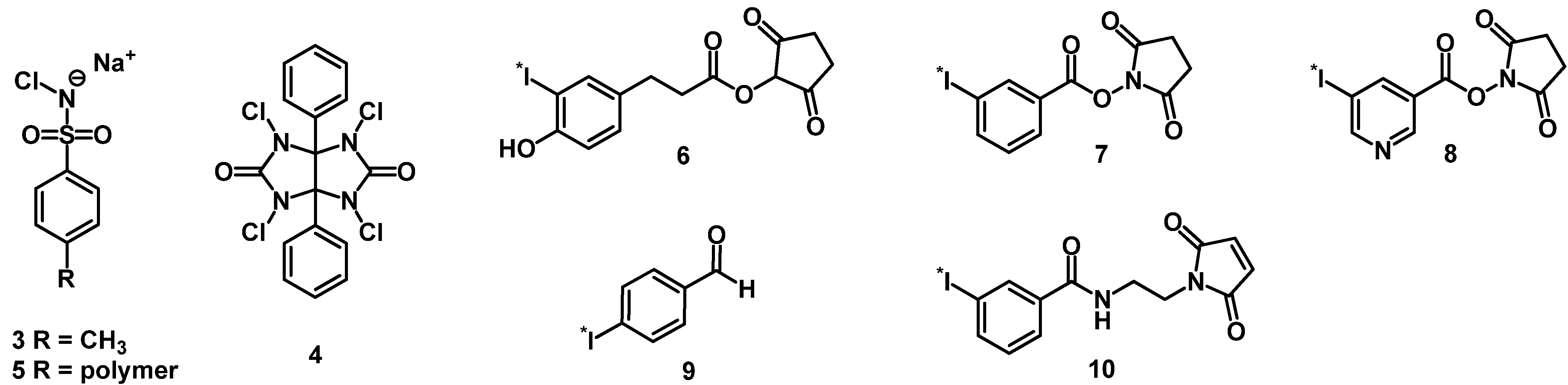 Generally, radioiodination of peptides can be performed using one of following methods: radioiodination by electrophilic substitution (direct) or radioiodination via conjugation (indirect). The tyrosine or histidine side chains in peptides offer the possibility of electrophilic aromatic substitution by electrophilic radioiodine (*I+) with high efficiency under mild conditions. Several oxidizing agents can be used for the generation of electrophilic iodine (*I+) such as chloramine T (sodium tosylchloroamide) (3) or Iodogen® (1,3,4,6-tetrachloro-3α,6α-diphenylglycoluril) (4) (Figure 3). Polymer-bound chloramine T (IodoBeads®) (5) or vials coated with Iodogen® have the advantage that no reducing agent is needed to quench the labeling reaction, since they are insoluble and can be easily separated from the reaction mixture.