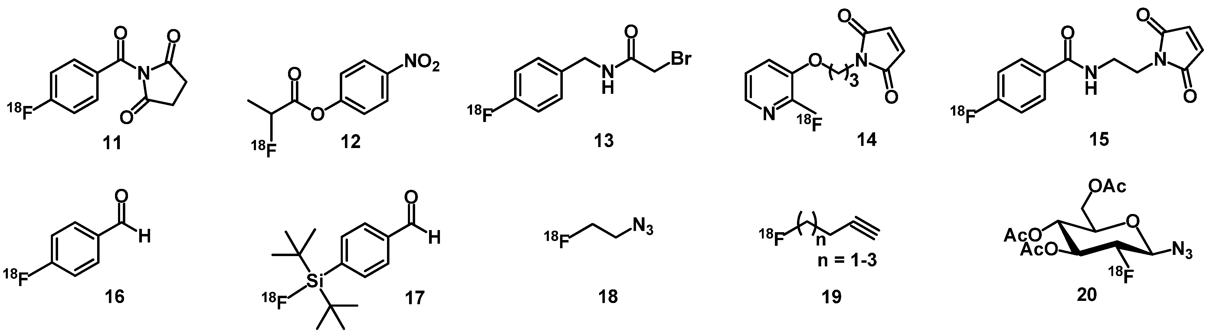18F-labeling of peptides by direct labeling is not possible via nucleophilic substitution under mild conditions. Mild conditions are required as the elevated temperatures and strong bases that are used for radiofluorination destroy the peptidic biomolecules. Therefore, 18F-labeled prosthetic groups have been developed. For this purpose specific functionalities, such as amine, aminooxy, hydrazine, alkyne or azide groups have to be introduced into the peptide precursor. Amino reactive prosthetic groups (Figure 4) are widely used for [18F]fluorination of peptides [24,54,55], since [18F]SFB (N-succinimidyl-4-[18F]fluorobenzoate) (11) and [18F]NPFP (4-nitrophenyl-2-[18F]fluoropropionate) (12) allow conjugation in good yield and poses high metabolic stability [56,57]. Numerous [18F]fluorinated prosthetic groups based on thiol-maleimide coupling chemistry or thiol-selective alkylation reactions, e.g., N-(4-[18F]fluorobenzyl)-2-bromoacetamide (13), 1-[3-(2-[18F]fluoropyridin-3-yloxy)propyl]pyrrole-2,5-dione ([18F]FPyMe, 14) and N-2-(4-[18F]-fluorobenzamido) ethylmaleimide ([18F]FBEM, 15), have been developed for the conjugating to peptides [58,59]. As the synthesis of these prosthetic groups include multistep procedures, there is still the need for 18F-labeling methods suitable for faster peptide labeling. Chemoselective conjugation methods using aldehydes, alkyne or azide derivatives labeled with 18F seem to be more efficient for clinical application, such as [18F]FBA (4-[18F] fluorobenzaldehyde, 16), [18F]SiFA-A (p-(di-t-butyl[18F]fluorosilyl)benzaldehyde) (17), [18F]fluoro- ethylazide (18), [18F]fluoroalkynes 19 and [18F]-glycosyl azide (20) [60,61,62,63,64]. The derivatives are synthesized in one step and used to form oximes, hydrazones or 1,2,3-triazoles of unprotected peptides.