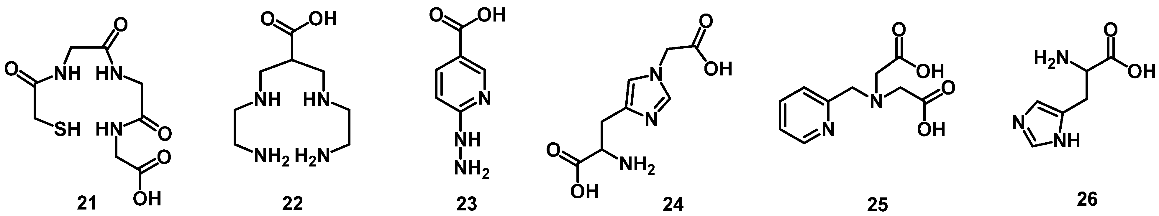 99mTc is still the most frequently used radionuclide in diagnostic applications of nuclear medicine, due to its ideal nuclear physical properties, availability through a commercial 99Mo-99mTc generator, the low production cost and easy and rich labeling chemistry. Most radiopharmaceuticals have 99mTc-complexes in the oxidation state of +V. 99mTc is eluted from the generator in physiological saline in its chemically inert oxidation state of +VII as the complex ion 99mTcO4−. 99mTc(+VII) must be reduced to a lower oxidation. For this purpose different reducing agents, such as Na2S2O4, SnCl2, phosphines or zinc, can be used in the presence of suitable ligands. The labeling of peptide based radiopharmaceuticals usually follows the postconjugation labeling strategy. A bifunctional chelator is first covalently bound to the peptide. Subsequently, 99mTcO4ˉ is reduced with Sn(II) and complexed by the chelator. For this strategy a variety of bifunctional chelators have been designed and tested (Figure 5). The structure of the resulting complexes and the oxidation state of technetium depend on the reducing agent, the ligand as well as coligands. The tetradentate bifunctional chelators based on N3S [67,68], N2S2 [69], such as MAG3 (mercaptoacetyltriglycine) (21), form square pyramidal complexes containing the [Tc=O]3+ core. The trans-[O=Tc=O]+ core, which forms octahedral complexes can be prepared with tetraamine ligands [70,71,72,73,74,75,76]. The use of N4 cores (22) offers the advantages of hydrophilic Tc-complex without isomeric structural influence. HYNIC (hydrazinonicotinic acid, 23) is widely used for the coupling of technetium to peptides [77,78,79]. It acts as a mono or bidentate ligand [80]. In both cases coligands, such as EDDA, tricine or nicotinic acid are required to complete the coordination of the [Tc]-HYNIC core. The use of coligands can have a positive side effect, since they can influence the lipophilicity of the radiopharmaceutical and the in vivo stability of the 99mTc-complexes, which in turn affects the radiopeptide pharmacokinetics [81].