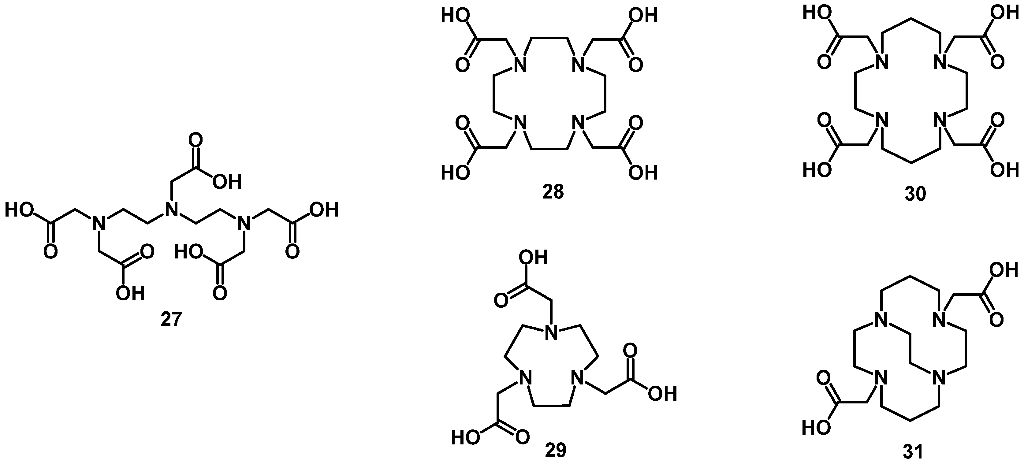 Yttrium and lanthanide ions with an oxidation state of 3+ are hard Lewis acids as well, and tend to form very stable complexes with hard ligands. Because of their large size, their complexes have the high coordination numbers of 8 and even 9. The labeling of peptides with these radionuclides has been performed using mainly macrocyclic polyaminopolycarboxlic bifunctional chelating agents [87]. Due to the favorable pharmacokinetic profiles, DOTA derivatives have been used for the 86/90Y and 177Lu labeling of various peptides. DOTA provides eight donor atoms and the appropriate cavity size to form more stable complexes with these radionuclides than acyclic chelating agents and TETA (1,4,8,11-tetraazacyclododecane-1,4,8,11-tetraacetic acid, 30, Figure 6) derivatives. Thermodynamic stability and kinetic inertness are the most important factors for in vivo applications. DOTA derivatives were efficiently coupled to peptides as DOTA monoamides, where the kinetic inertness in vivo is not changed in comparison to DOTA. DOTA and TETA have been used for the production of 67/64Cu-labeled peptides. They show moderate kinetic stability under in vivo conditions. Cu-complexes with cross-bridged cyclam such as CB-TE2A (4,11-bis(carboxymethyl)-1,4,8,11-tetraazabicyclo[6.6.2]-hexadecane, 31, Figure 6) improve the kinetic inertness and thus the pharmacokinetics of the radiolabeled peptide.