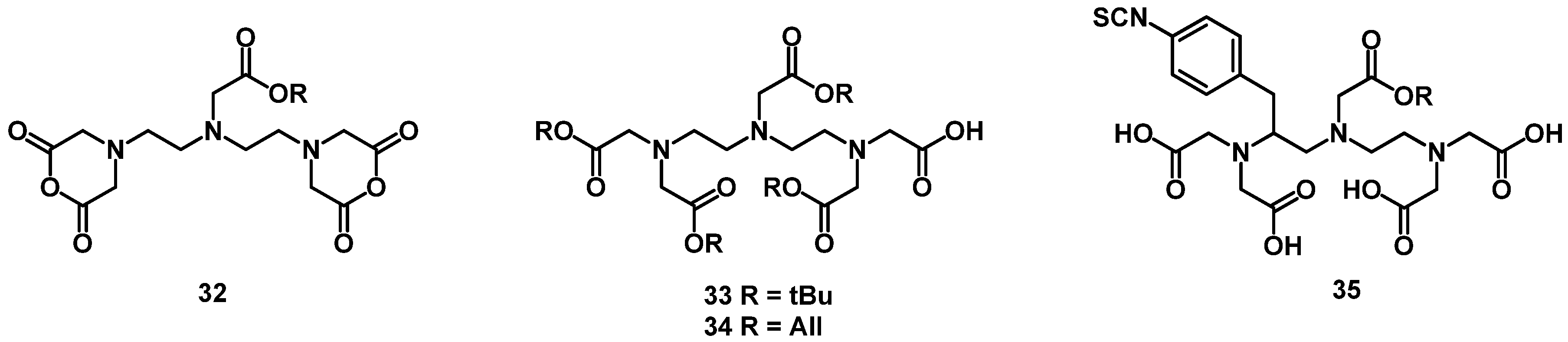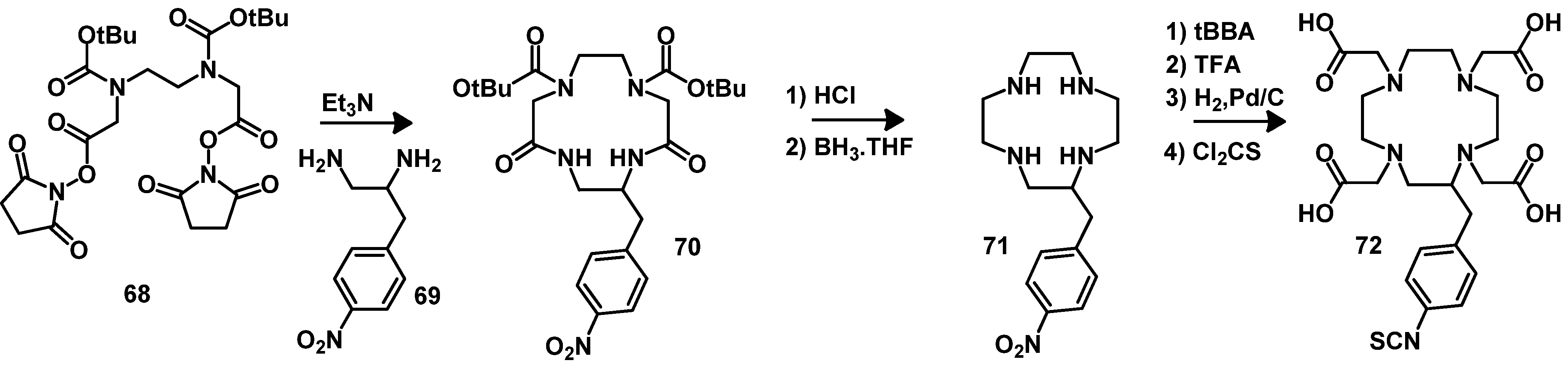- Brechbiel, M.W.; McMurry, T.J.; Gansow, O.A. A direct synthesis of a bifunctional chelating agent for radiolabeling proteins. Tetrahedron Lett. 1993, 34, 3691–3694. [Google Scholar] [CrossRef]