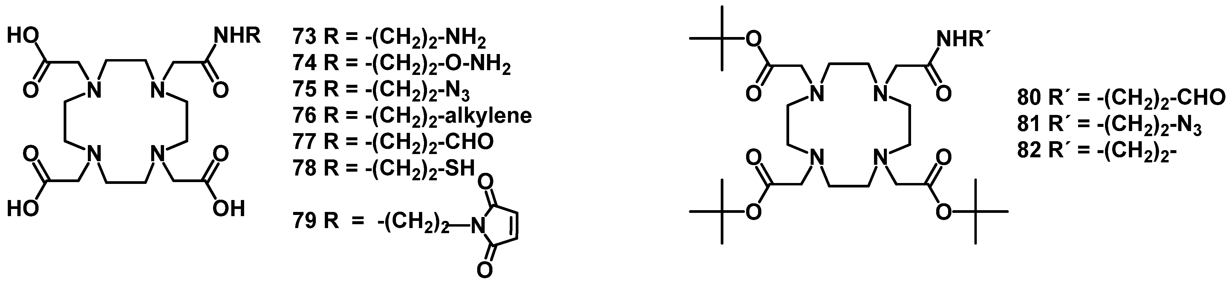 - Knor, S.; Modlinger, A.; Poethko, T.; Schottelius, M.; Wester, H.J.; Kessler, H. Synthesis of novel 1,4,7,10-tetraazacyclodecane-1,4,7,10-tetraacetic acid (DOTA) derivatives for chemoselective attachment to unprotected polyfunctionalized compounds. Chemistry 2007, 13, 6082–6090. [Google Scholar] [CrossRef]